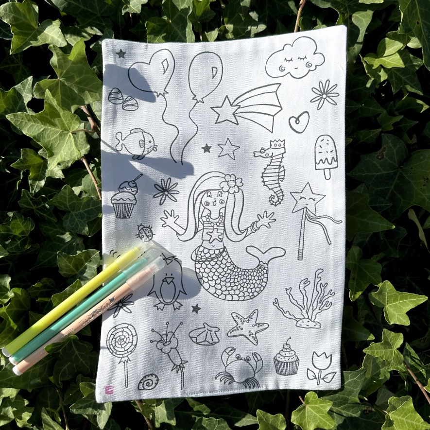 Tu es fan de sirène ? Tu aimes les trucs qui scintillent et les paillettes ? As-toi les grandes aventures dans un monde imaginaire, où tout peut arriver ? Tu as vu mille fois La Petite Sirène et tes copines t’appellent Ariel ? Maintenant, c’est à toi de colorier ton monde unique sur cette feuille en tissu !