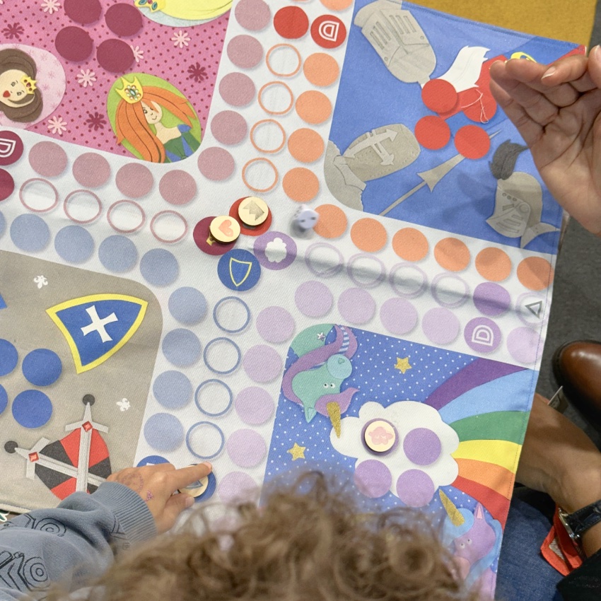 Ici le jeu ludo (le cousin des petits chevaux) un des jeux de société les plus classiques. Et qui se joue dans toutes les familles, du plus jeune au plus âgé !
