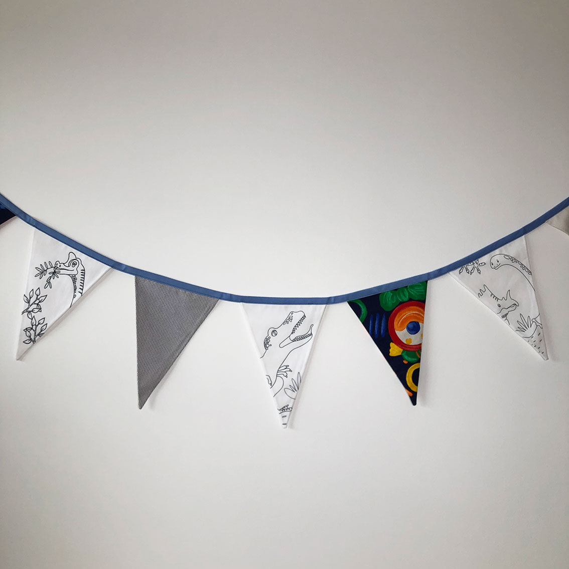 - 3 fanions en tissu illustrés (motif dinosaures, une des thématiques préférées des enfants)